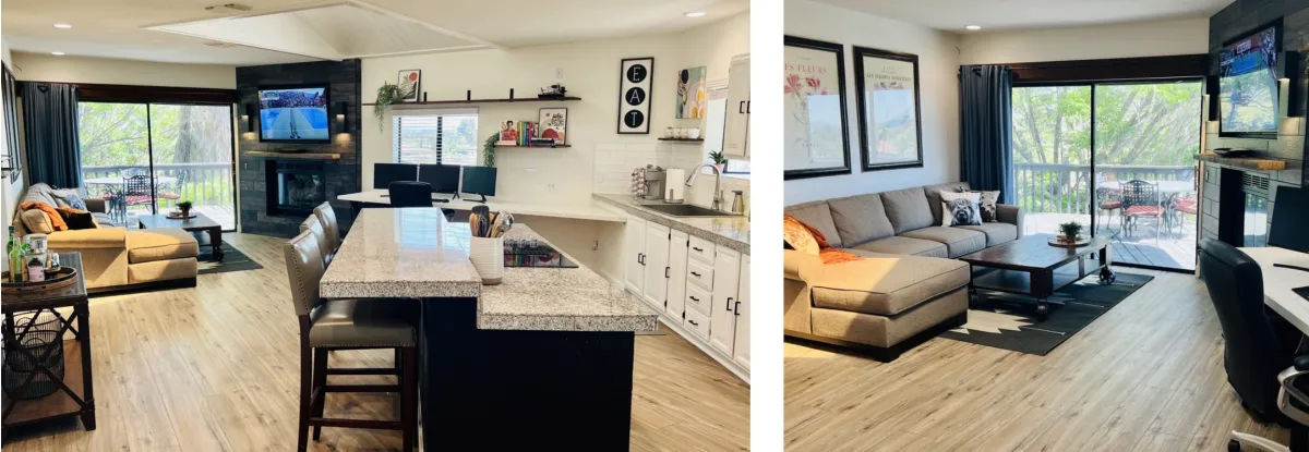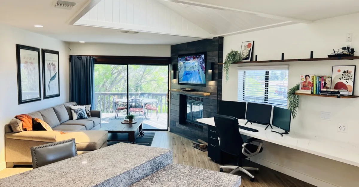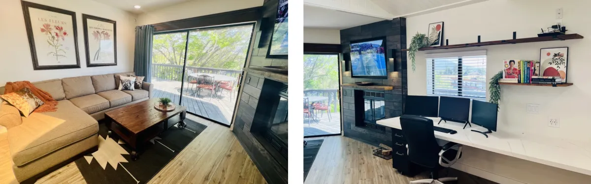 The cozy living room includes a sofa with chaise lounge, flat screen LG Smart TV and Duraflame-burning fireplace. The first of two home office spaces is located off the living room and includes an expansive 20 ft built-in quartz countertop work station with multiple outlets, USB, and USB-C ports, drawers, filing cabinet, and bookshelves. A large glass sliding door leads to the outdoor panoramic deck with a dining table with chairs. The deck is situated among the treetops and offers peaceful, quiet vineyard views.