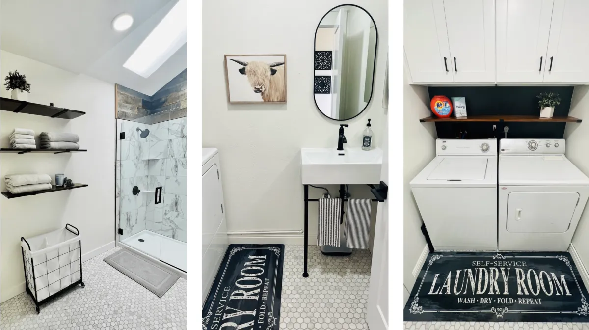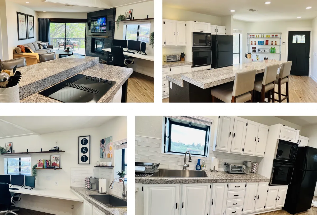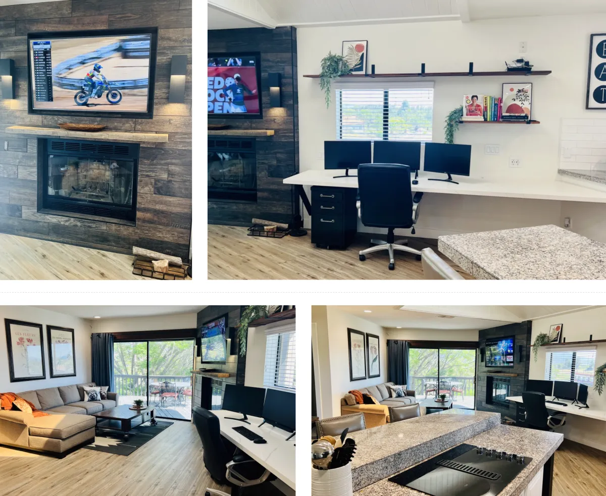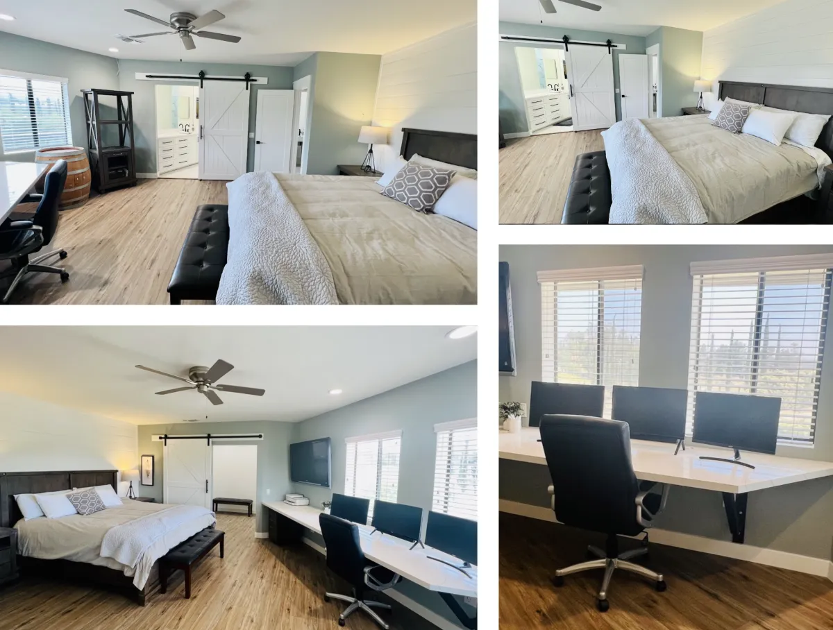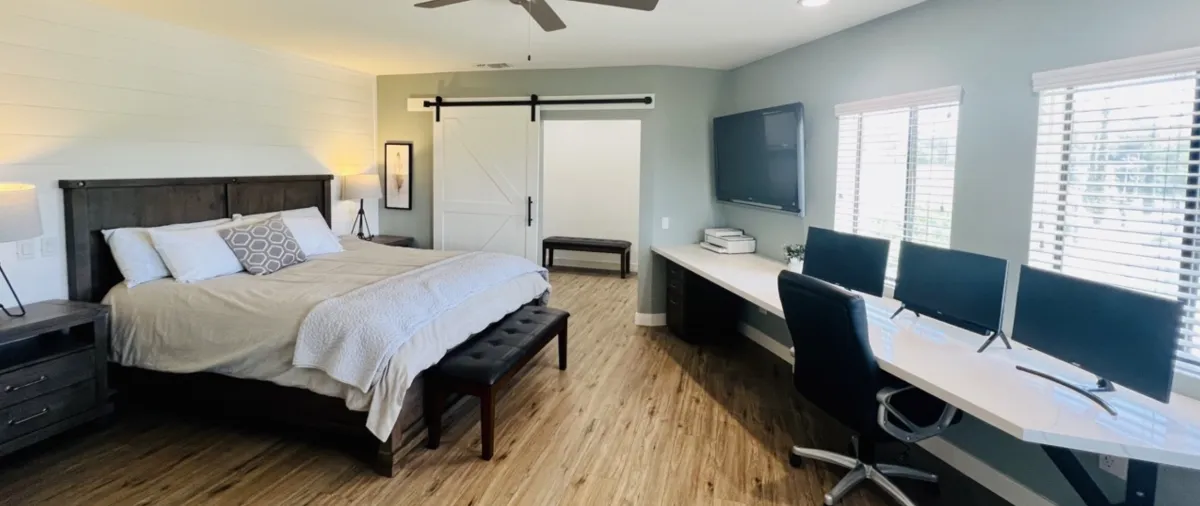 The spacious master bedroom includes a California King bed, live/work office, huge walk-in closet, flat screen television, wood laminate flooring, linens, and en-suite bathroom with shower and bathtub. The second of two home office spaces is located in the master bedroom and includes an expansive 20 ft built-in quartz countertop work station with multiple outlets, USB, and USB-C ports, drawers, filing cabinet, and bookshelves. Master Bathroom includes a beautiful quartz countertop with multiple drawers and storage under the sink, full-size tile shower with reclaimed barnwood and skylight.