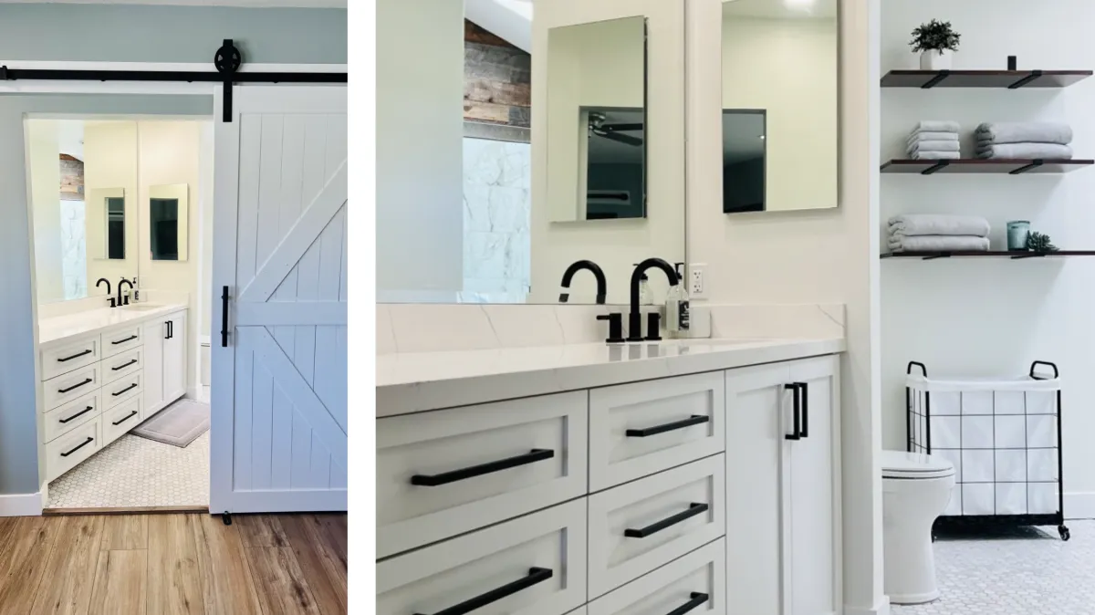Custom closet organizers and barndoors in the master bedroom walk-in closet
