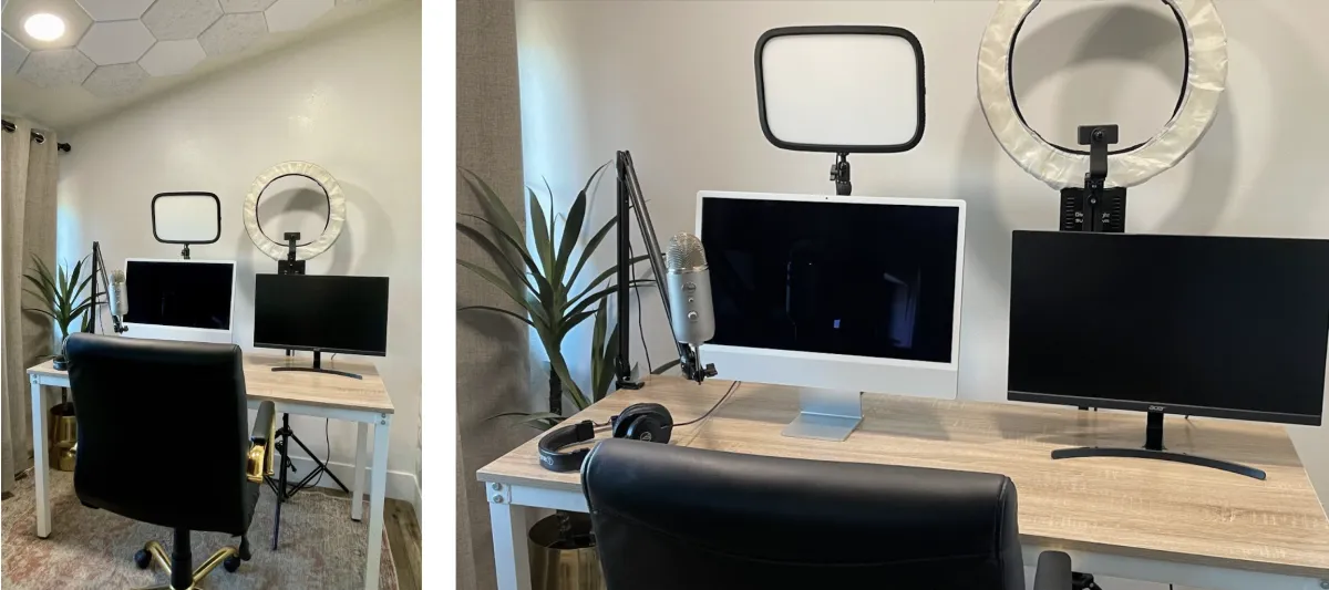 The podcast studio is the the perfect place to record your Podcast, YouTube Videos, Online Courses, and Zoom Calls. Small enough to monitor and control sound quality. Spacious enough for a desk, chair, desktop or laptop computer, multiple monitors, multiple cameras, rigged lighting, ring light, or pillow lights, microphone, boom arm, and accent lighting. Ample outlets for plugging in equipment.